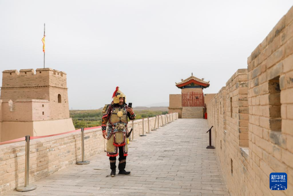 9月26日,李森在拍攝宣傳甘肅嘉峪關關城景區(qū)的短視頻,他在短視頻平臺已有40多萬粉絲。新華社記者 方欣 攝