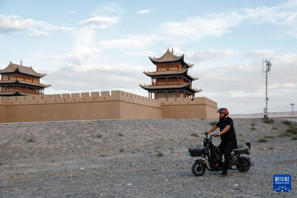 7月13日,李森結(jié)束一天的工作離開甘肅嘉峪關關城景區(qū)騎電動車回家。新華社記者 方欣 攝