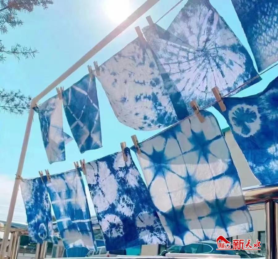 “一把青秧趁手青,輕煙漠漠雨冥冥。東風(fēng)染盡三千頃,白鷺飛來(lái)無(wú)處停。”如同染盡三千的春風(fēng),展示架上的藍(lán)染作品,如遠(yuǎn)山近水大河奔騰,染出了陽(yáng)光,染出了雪山,還原的是自然,又抽象出一派渺遠(yuǎn)的意境。