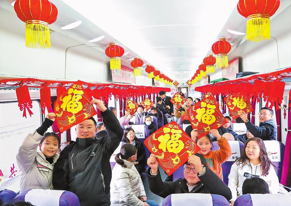 7504次“富民號(hào)”列車上張燈結(jié)彩,歡聲笑語(yǔ)。新春佳節(jié)來(lái)臨之際,無(wú)數(shù)人心懷著對(duì)家鄉(xiāng)的眷戀,踏上溫馨的回家之路。 新甘肅·甘肅日?qǐng)?bào)記者丁凱攝