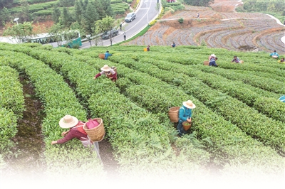 重慶市綦江區(qū)立足綠色生態(tài)資源稟賦,將茶產業(yè)打造成助力鄉(xiāng)村振興的主導產業(yè),讓“綠葉子”成為“金葉子”。圖為該區(qū)石角鎮(zhèn)新農村村民在茶園內采摘鮮茶葉。新華社發(fā)