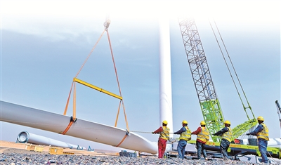 甘肅省高臺縣境內有戈壁荒漠2000多平方公里,近年來憑借風光資源優(yōu)勢,發(fā)力新能源產業(yè)賽道。圖為該縣某新能源風力發(fā)電項目建設現場,工作人員正在安裝風力發(fā)電機。新華社發(fā)
