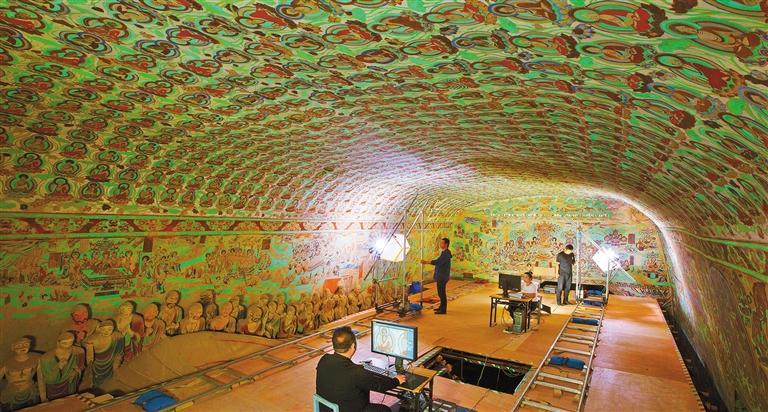 莫高窟第148窟數(shù)字化采集工作現(xiàn)場。敦煌研究院在國內(nèi)率先進行文物數(shù)字化的探索研究,形成了一套科學(xué)的壁畫彩塑數(shù)字化技術(shù),制定了14項文物數(shù)字化保護技術(shù)標準與規(guī)范。