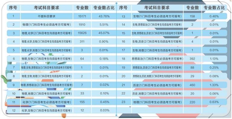 據(jù)了解,根據(jù)《甘肅省深化高等學(xué)校考試招生綜合改革實(shí)施方案》要求,從 2021年秋季入學(xué)的普通高中一年級(jí)學(xué)生開(kāi)始,實(shí)行基于統(tǒng)一高考和高中學(xué)業(yè)水平考試成績(jī)、參考綜合素質(zhì)評(píng)價(jià)的高??荚囌猩J?。到2024年,基本形成分類(lèi)考試、綜合評(píng)價(jià)、多元錄取的高校考試招生制度,健全促進(jìn)公平、科學(xué)選才、監(jiān)督有力的高??荚囌猩w制機(jī)制。此次在我省報(bào)送選考科目要求的高校專(zhuān)業(yè)共計(jì)64092條,其中本科專(zhuān)業(yè)34670條。專(zhuān)業(yè)選考科目要求共有23種組合,其中不提科目要求的本科專(zhuān)業(yè)數(shù)量占本科專(zhuān)業(yè)總數(shù)的43.76%,含物理科目的占比為51.79%,含化學(xué)科目的占比為46.46%,含歷史科目的占比為1.74%,含“物理+化學(xué)”科目的占比為45.98%。