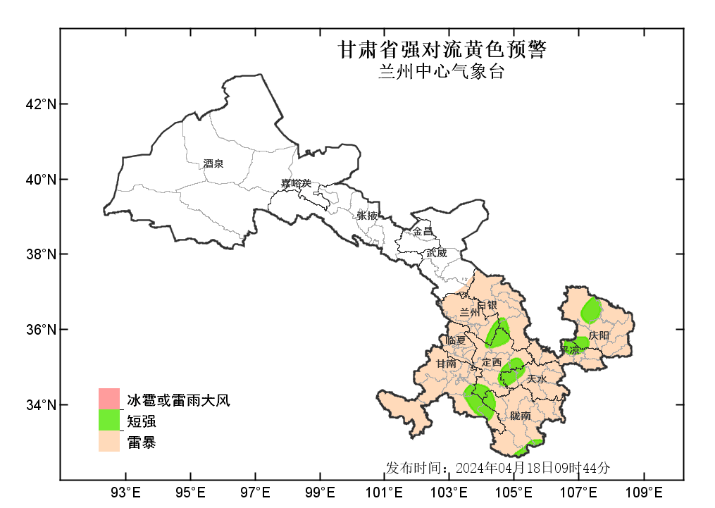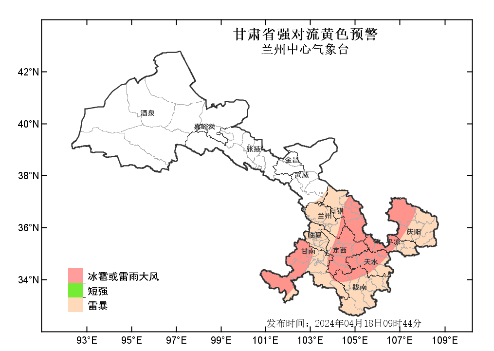 中國甘肅網(wǎng)4月18日訊(西北角·中國甘肅網(wǎng)記者 沈文剛)4月18日9時(shí)44分,蘭州中心氣象臺發(fā)布強(qiáng)對流黃色預(yù)警:預(yù)計(jì)今天白天到夜間,武威以東大部分地方有雷暴;其中,白銀、定西、甘南、天水等市州部分地方及蘭州、隴南、平?jīng)觥c陽等市局部地方有雷雨大風(fēng)或冰雹;甘南、隴南、定西、天水、白銀、蘭州、平?jīng)?、慶陽等州市局部地方有短時(shí)強(qiáng)降水,最大小時(shí)雨強(qiáng)為20-30毫米。