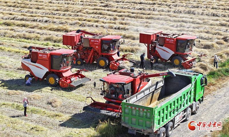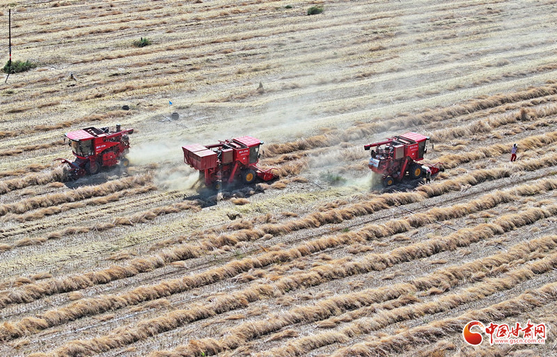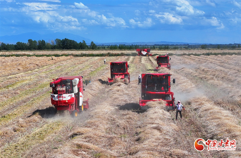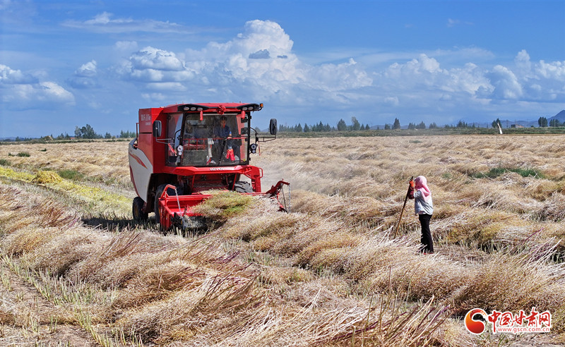 8月24日,在民樂縣新天鎮(zhèn)韓營村千畝油菜種植基地,村民駕駛農(nóng)機(jī)在田間開展油菜籽搶收作業(yè)。