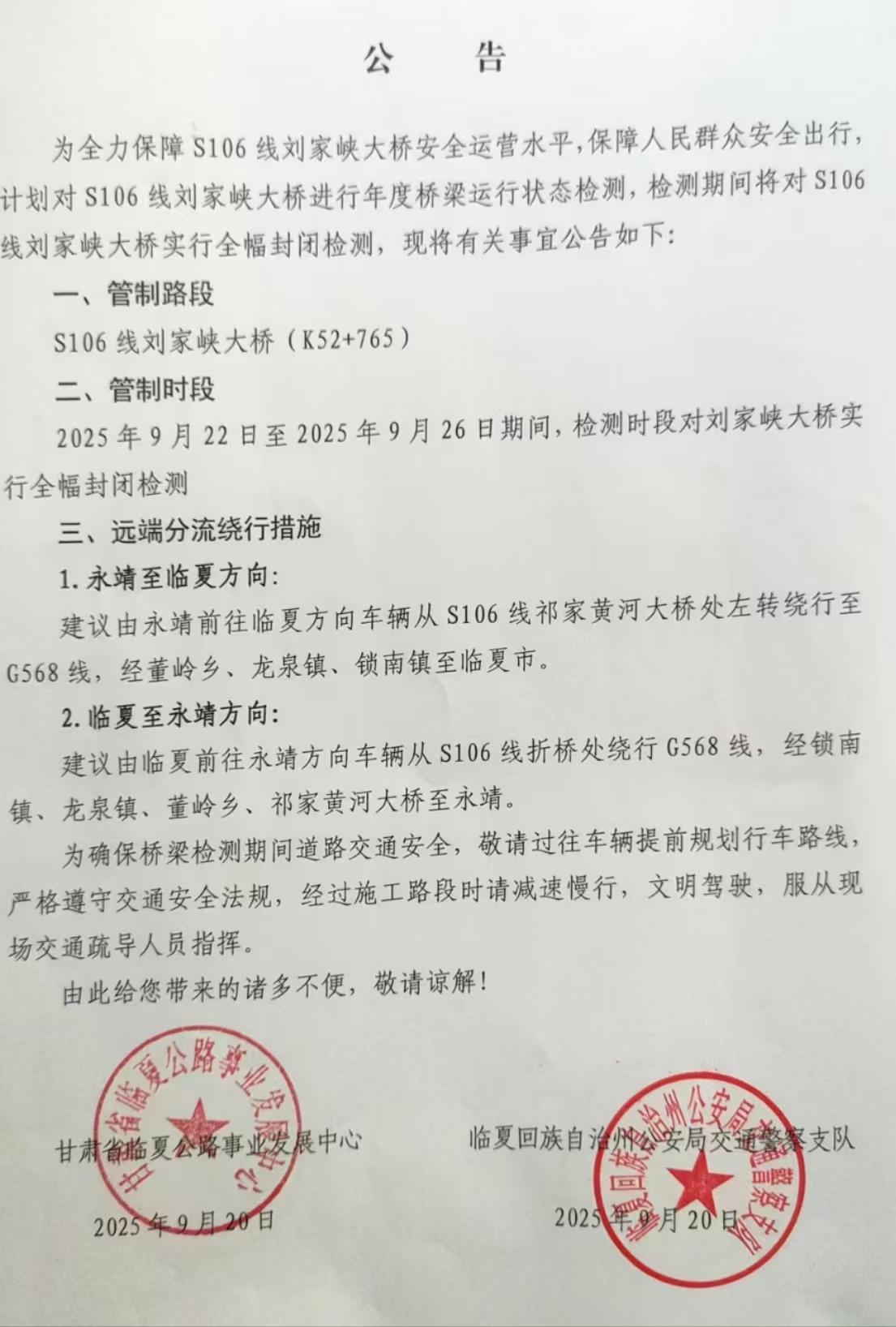 中國甘肅網(wǎng)9月20日訊(西北角·中國甘肅網(wǎng)記者 宋芳科 )記者從臨夏州公路事業(yè)發(fā)展中心獲悉,為全力保障S106線劉家峽大橋安全運(yùn)營水平,保障人民群眾安全出行,臨夏州公路事業(yè)發(fā)展中心計(jì)劃對(duì)S106線劉家峽大橋進(jìn)行年度橋梁運(yùn)行狀態(tài)檢測(cè),2025年9月22日至2025年9月26日期間,將對(duì)S106線劉家峽大橋?qū)嵭腥忾]檢測(cè)。
