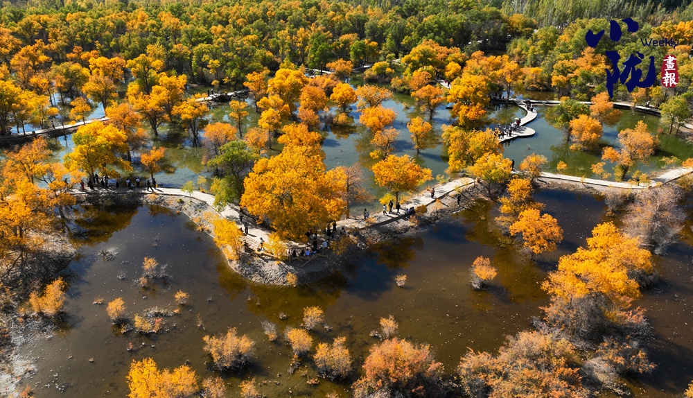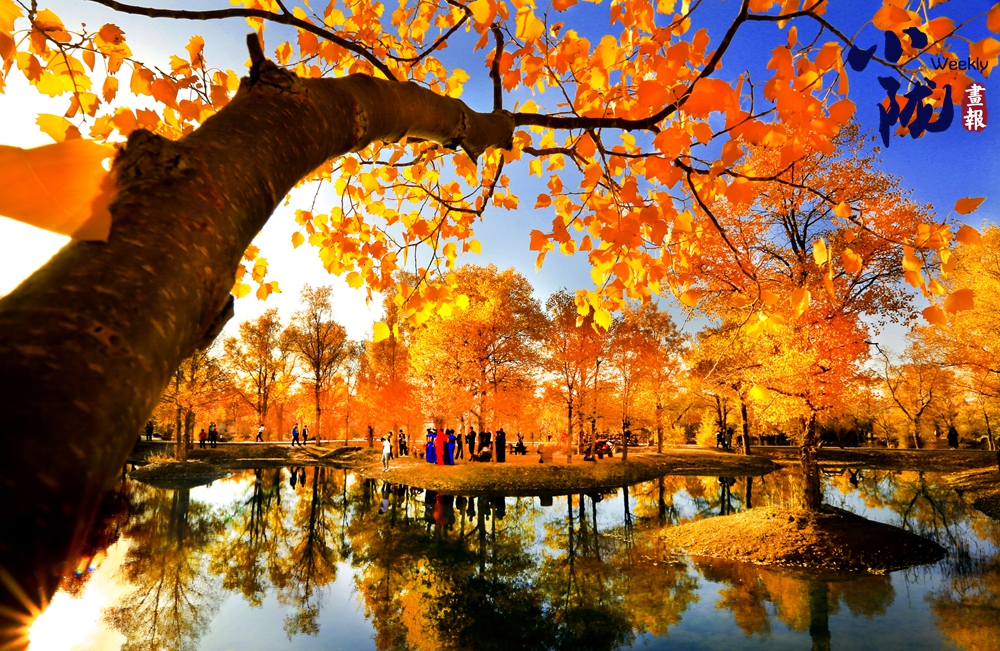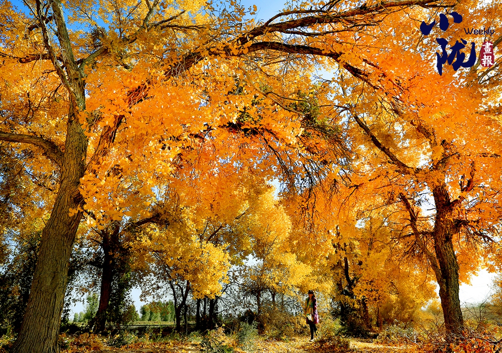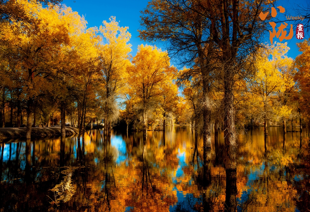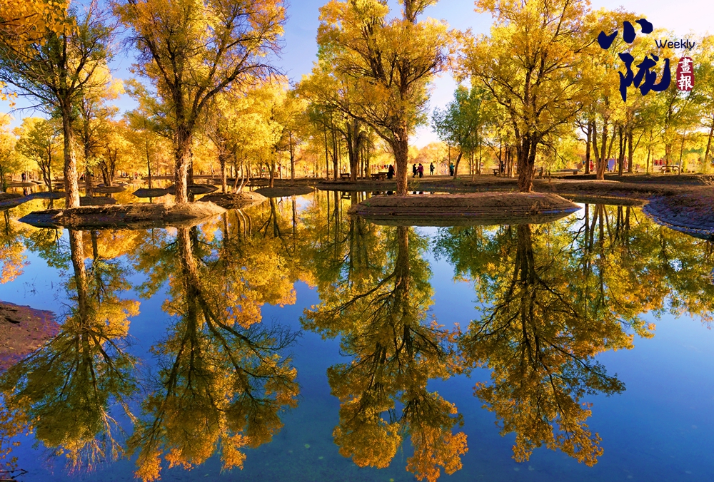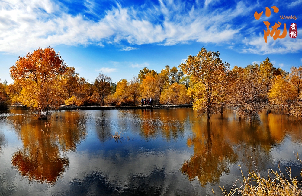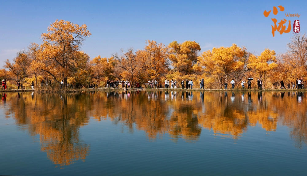 胡楊茂盛,疊翠流金,裊裊身姿倒影湖中。風(fēng)一吹,樹(shù)梢輕顫,成千上萬(wàn)片葉子像被點(diǎn)燃的火焰,在藍(lán)得沒(méi)有一絲雜質(zhì)的天空下翻涌、跳躍,充滿(mǎn)詩(shī)意。林間小道上,游客悠閑漫步,盡享美好時(shí)光。