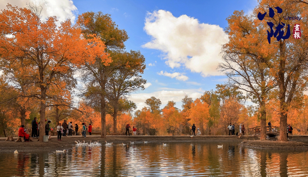 碧波蕩漾的金波湖倒映著胡楊,形成水中有林、林中有水的絕美畫(huà)面。游人如織,小橋流水,碧波蕩漾,白鵝嬉戲,若不是周邊金黃色的胡楊提醒,會(huì)讓人誤以為來(lái)到了江南水鄉(xiāng)。