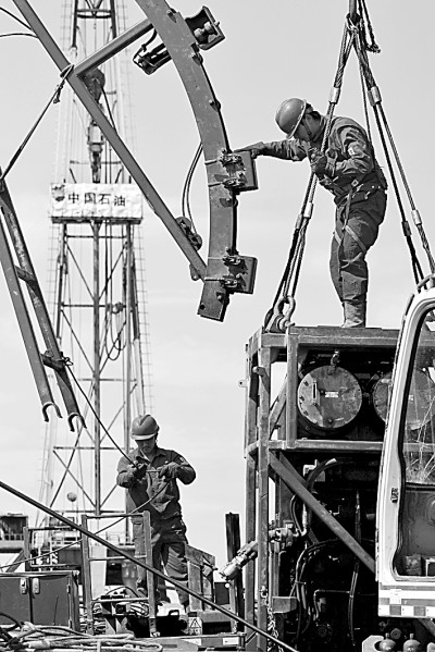 在位于克拉瑪依的新疆油田公司百口泉采油廠瑪湖第一采油作業(yè)區(qū),石油工人正在進(jìn)行測(cè)試作業(yè)。閔勇攝/光明圖片