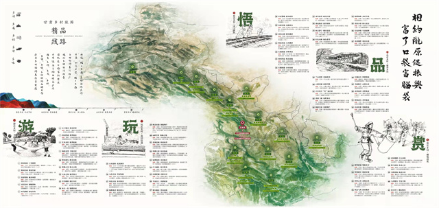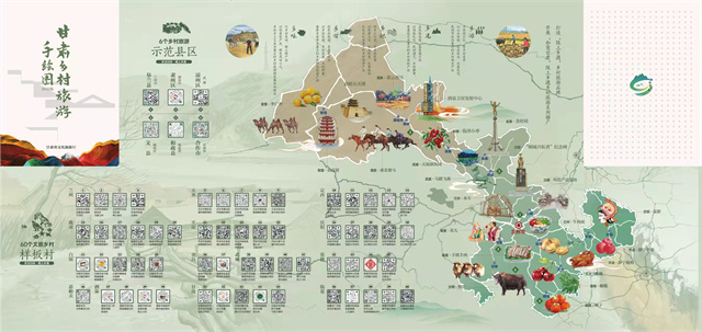 據(jù)介紹,手繪圖以“相約隴原促振興·富了口袋富腦袋”為主題,突出“圖文并茂、服務游客、便于攜帶、適于珍藏”等特點,對2022年創(chuàng)建的6個鄉(xiāng)村旅游示范縣,60個文旅振興鄉(xiāng)村樣板村全部開發(fā)設計了電子“二維碼”,設置了甘肅省鄉(xiāng)村旅游60條四季精品線路,生動形象地展現(xiàn)了甘肅鄉(xiāng)村旅游特色元素和資源產(chǎn)品信息,對幫助游客暢游甘肅鄉(xiāng)村、感知隴原文化、體驗鄉(xiāng)村魅力具有重要意義。