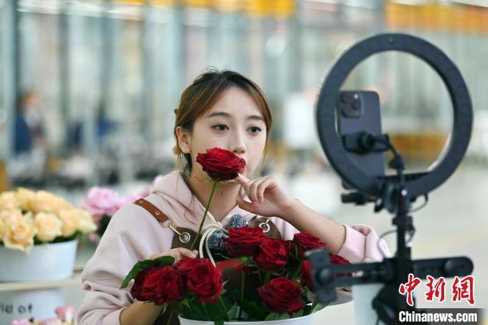 11月20日,在甘肅省臨夏回族自治州臨夏市百益億農(nóng)國際鮮花港內(nèi),工作人員進(jìn)行網(wǎng)絡(luò)直播售賣鮮切玫瑰。九美旦增 攝