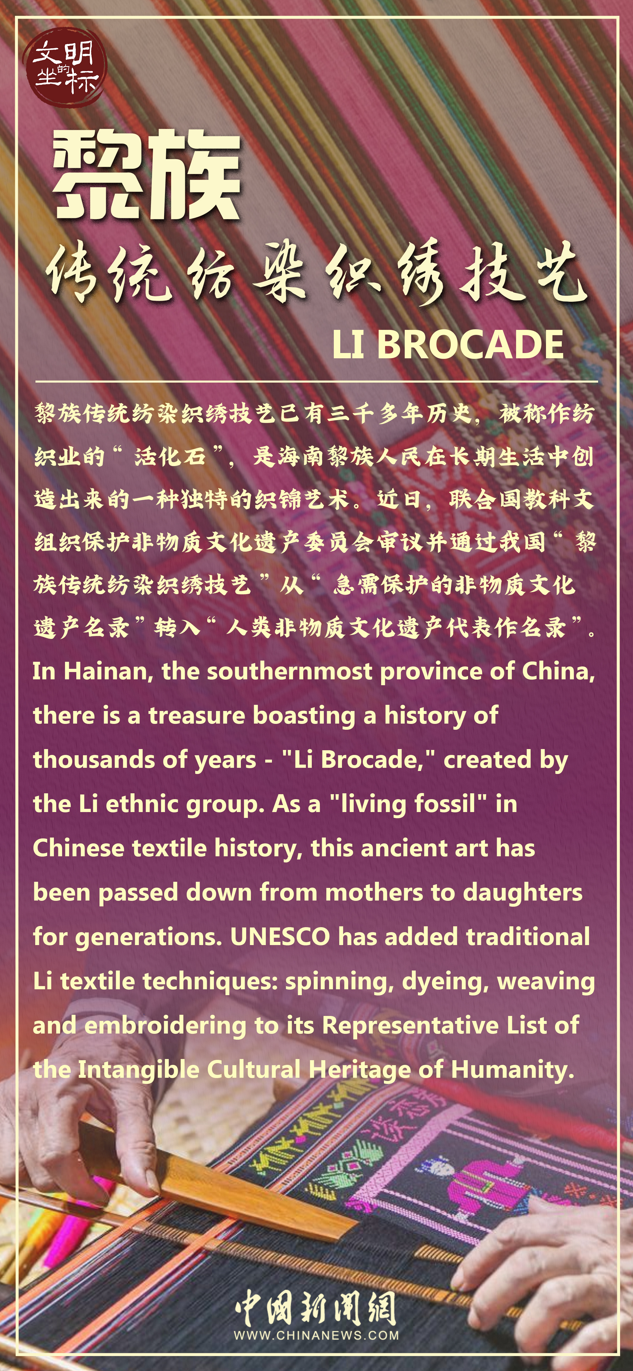 日前,黎族傳統(tǒng)紡染織繡技藝從聯(lián)合國(guó)教科文組織“急需保護(hù)的非物質(zhì)文化遺產(chǎn)名錄”轉(zhuǎn)入“人類非物質(zhì)文化遺產(chǎn)代表作名錄”,引發(fā)關(guān)注。黎族傳統(tǒng)紡染織繡技藝已有三千多年歷史,被稱作紡織業(yè)的“活化石”。對(duì)于沒(méi)有創(chuàng)造文字的黎族,黎錦像是一本“史書(shū)”,寫(xiě)就了這個(gè)民族的文化和智慧。早在新石器時(shí)代,海南島上的黎族先民已會(huì)使用工具制作繩索或絲線。西漢時(shí)期,已織造出精美的“廣幅布”。至宋代,黎族的紡織達(dá)到很高水平。元代,黎族紡織工藝已傳至全國(guó)。黎族傳統(tǒng)紡染織繡技藝有麻織、棉織、織錦、印染(包括扎染)、刺繡、龍被等品種,以色彩鮮艷、圖案多樣、工藝精湛而聞名。如今,古老黎錦正穿越歷史長(zhǎng)河,以時(shí)尚化、潮流化、年輕化的設(shè)計(jì)形態(tài)融入現(xiàn)代日常生活。