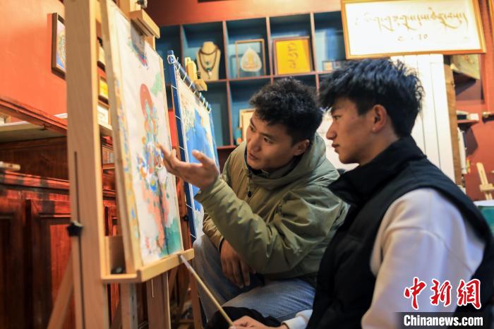 12月22日,在勒通古鎮(zhèn)的“唐卡館”,一位畫師繪制唐卡吸引游客駐足觀看。中新社記者 薛蒂 攝