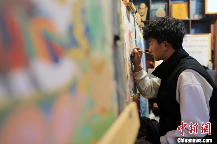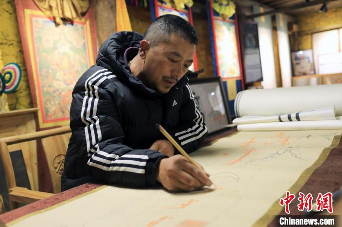 12月22日,在勒通古鎮(zhèn)的“唐卡館”,21歲的洛絨曲扎正在繪制唐卡。中新社記者 王磊 攝