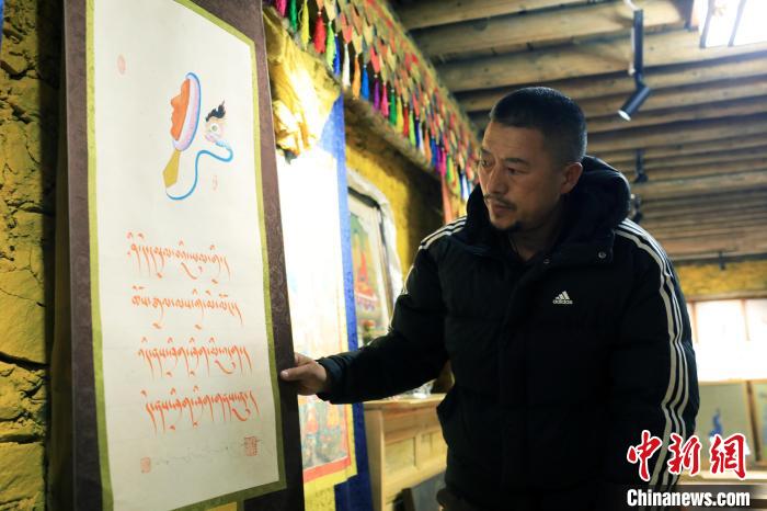 12月22日,藏文書法家昂旺曲批介紹自己的藏文書法作品。中新社記者 王磊 攝