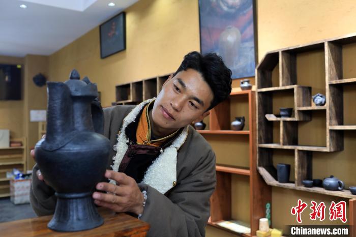 12月22日,在勒通古鎮(zhèn)的一家陶藝館內,陶藝師土登擺放土陶作品。中新社記者 王磊 攝