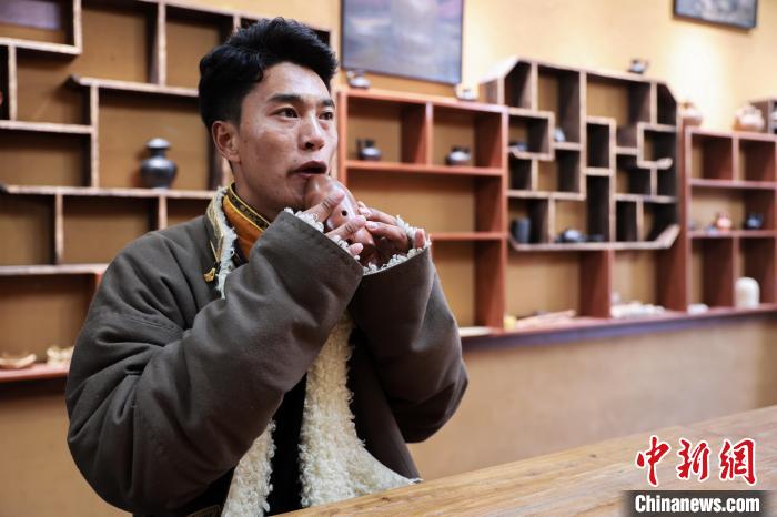 12月22日,在勒通古鎮(zhèn)的一家陶藝館內,陶藝師土登吹奏土陶制作的塤。中新社記者 薛蒂 攝