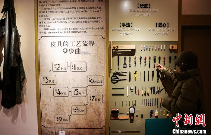 12月22日,在勒通古鎮(zhèn)的一家皮具店內,游客被掛在墻上的工具所吸引。中新社記者 薛蒂 攝