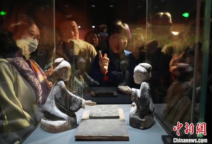 3月30日,觀眾在講解員的引導(dǎo)下欣賞甘肅省博物館藏的西漢彩繪木六博俑?!∈反宏?yáng)攝