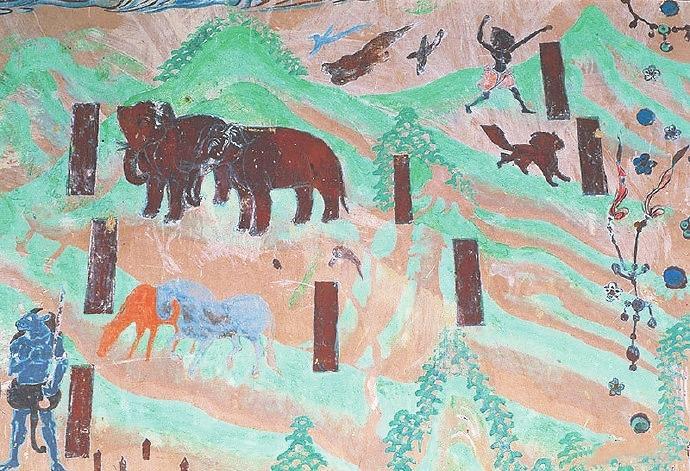 東漢應劭在《風俗通義·祀典》中寫道:“臘者,獵也,言田獵取獸以祭祀先祖也?;蛟唬?lsquo;臘者’接也,新故交接,故大祭以報功也。”意思是說一年中最后一個月是古人用來狩獵的月份,而狩獵所獲的獵物會被風干做成臘肉來祭祀祖先。這個月也被叫作“獵月”或是“臘月”。據(jù)《禮記·月令》記載,在秋季的最后一個月舉行田獵,借此機會教民戰(zhàn)陣,練習五種兵器的使用,并頒布乘馬的政令。獵畢,命令主管祭祀的官員,用獵獲的鳥獸祭祀四方之神。在莫高窟第249窟壁畫中有一幅“行獵圖”:畫面上都是些體形巨大的動物,有體態(tài)矯健的猛虎、疾馳駿逸的鹿群等。還有在奔馳的駿馬上拈弓搭箭窮追不舍的獵人、在飛奔的駿馬上淡定轉(zhuǎn)身從容射虎的獵人。整個畫面既緊張又靜謐美好,使人不由得對畫師精湛的技藝心悅誠服。