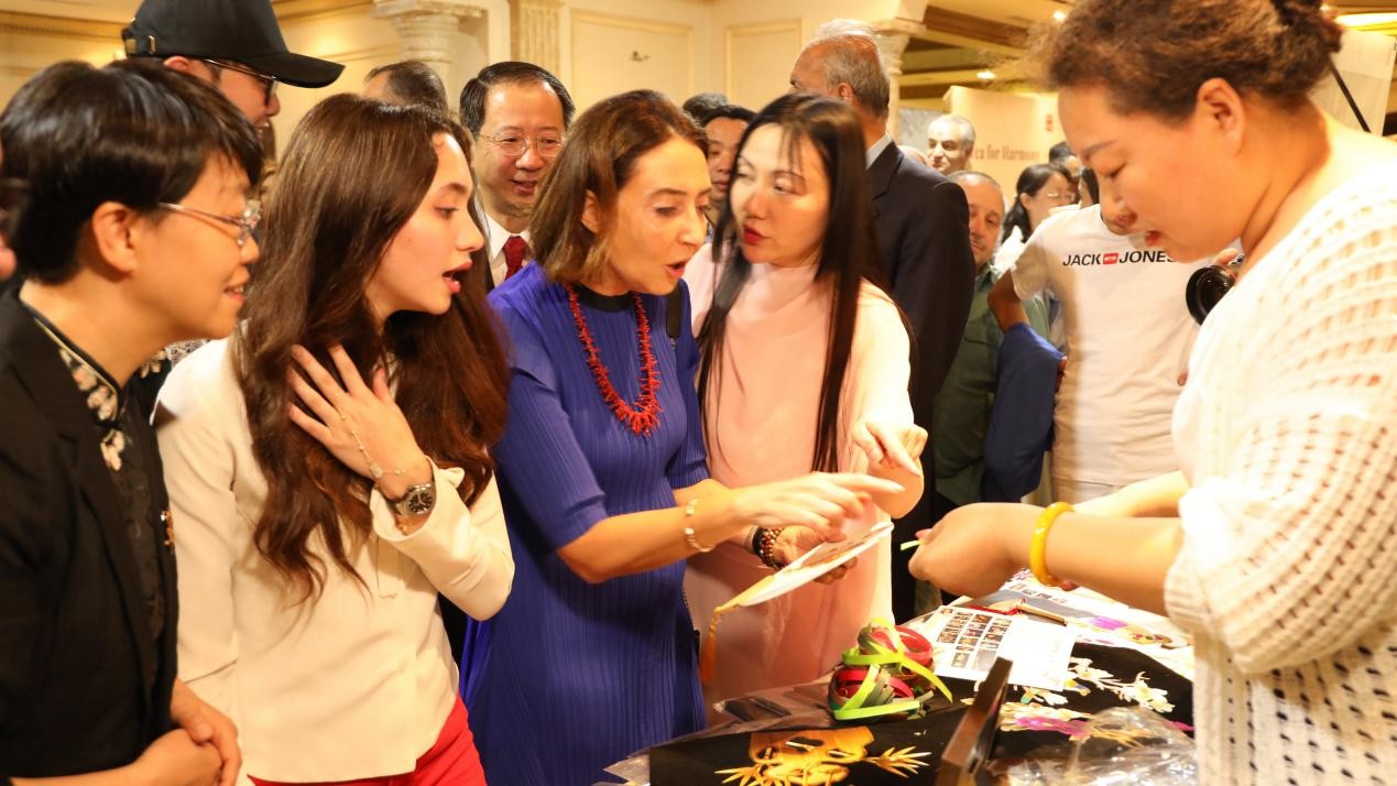 在今年5月18日“茶和天下——甘肅文旅推廣”安曼現(xiàn)場,唐彩萍現(xiàn)場制作的麥桿畫以獨特魅力驚艷全場,約旦王妃和加莉拉公主被其精湛的工藝深深吸引,親自上手體驗后豎起大拇指稱她是“奇人”。今年6月在“根與魂——甘肅省非遺澳門展演會”上,唐彩萍制作的麥桿畫《和平鴿》《中國龍》贏得與會人士的高度贊賞,澳門特別行政區(qū)政府文化局局長梁惠敏稱贊其“不同凡響,值得傳承發(fā)揚(yáng)”,并當(dāng)場邀請?zhí)撇势紴榘拈T小朋友傳授麥桿畫的制作方法。